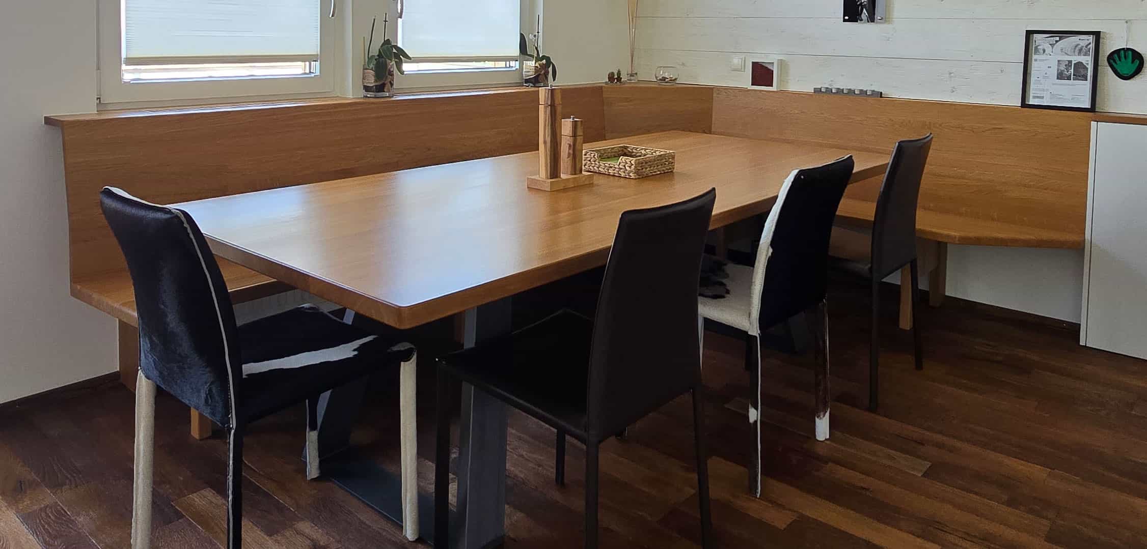 Aus dem Massivholztisch wird im Handumdrehen eine große Tafel, auf der Eckbank nach Maß machen es sich die Gäste bequem und im Alltag wird daraus wieder ein kompakter Esstisch mit Bank. So flexibel und wandelbar zeigt sich ein Esszimmer vom Tischler. Unabhängig davon, ob Sie schon eine ganz bestimmte Vorstellung haben oder noch ganz am Anfang der Ideenphase stehen: Wir entwickeln Holztische und Eckbänke, die Ihre Gäste zum Bleiben und Verweilen einladen.